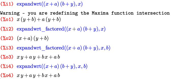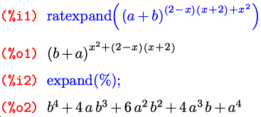Кроме того, разница, конечно, заключается и во внутреннем представлении: с точки зрения программы, после ratexpand() выражение будет по-прежнему общего вида. Соответственно и все результаты дальнейших рациональных действий с выражением не будут автоматически «канонизироваться». Я специально обращаю ваше внимание на схожесть между результатами этих двух различных функций, поскольку в документации эта схожесть никак не обозначена: в описании обеих функций и примерах к ним нет вообще никаких ссылок друг на друга.