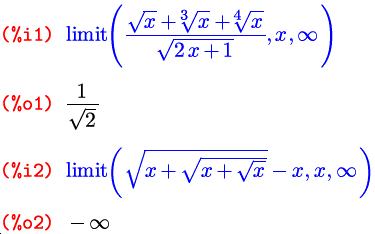 Из встроенного функционала Maxima в первую очередь стоит обратить внимание на несколько групп функций: работу с пределами, дифференцирование, интегрирование, поиск решений уравнений — как «просто», так и дифференциальных.